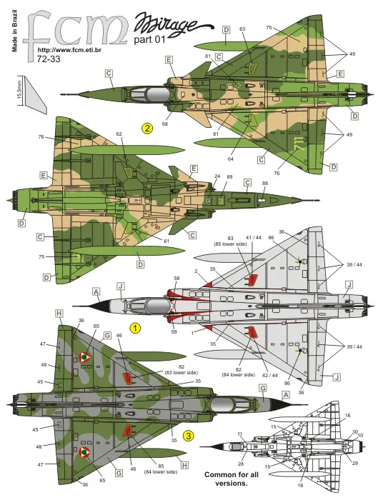 Decalque FCM Mirage III Brasil, Chile Libano FCM72033 Plastimodelismo - PetrohobbyPlastimodelismo - três (03) opções de pinturaPara usar recorte em volta do decalque desejado e coloque em um pires c/ água, quando deslizar do papel, aplique com cuidado sobre a superfície do modelo usando um cotonete